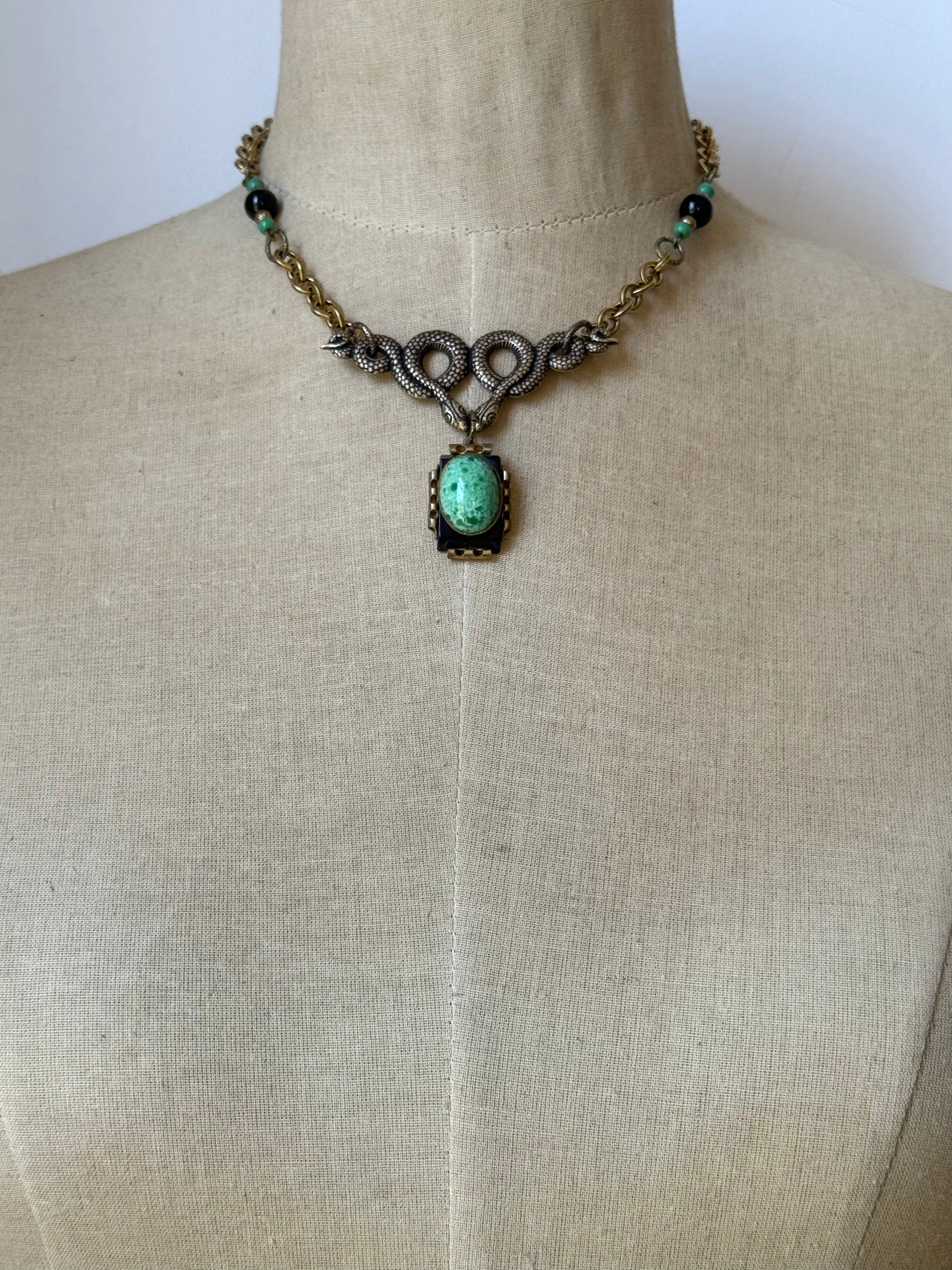 1930’s czech peking glass pendant attached to modern day double snake antique brass plated finding.